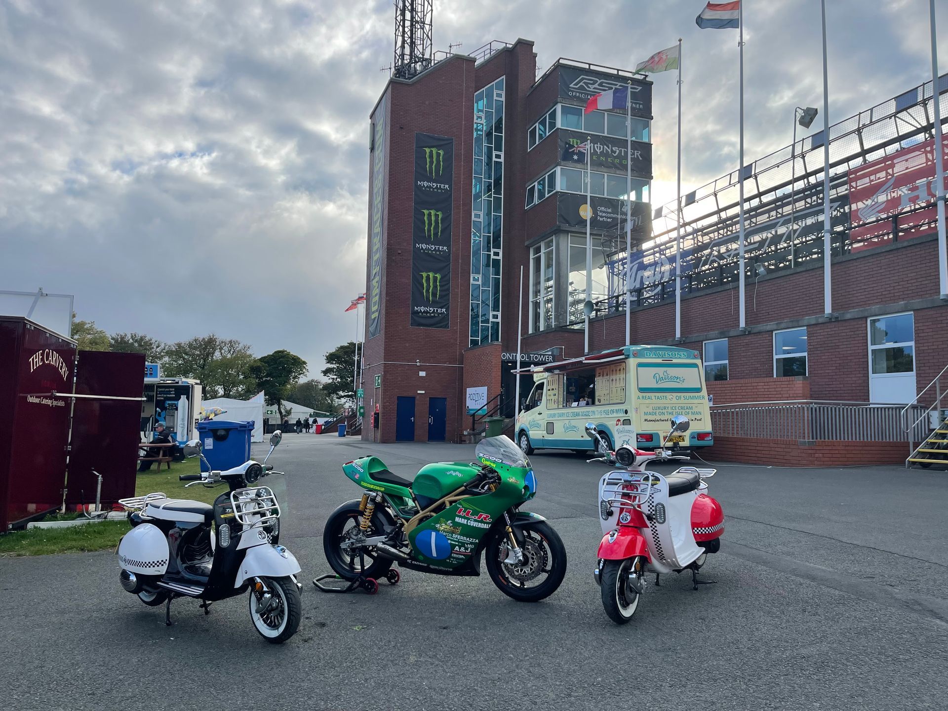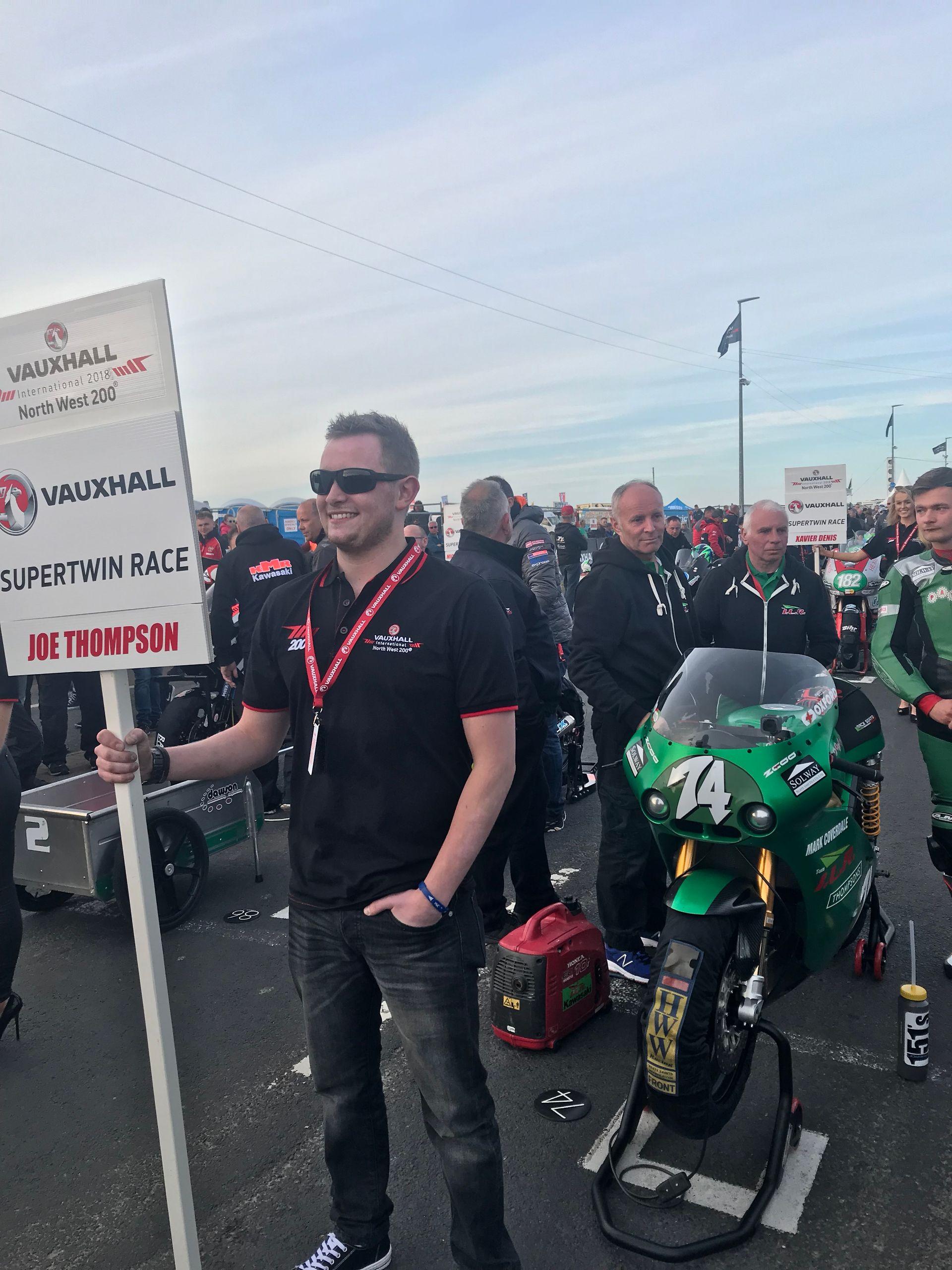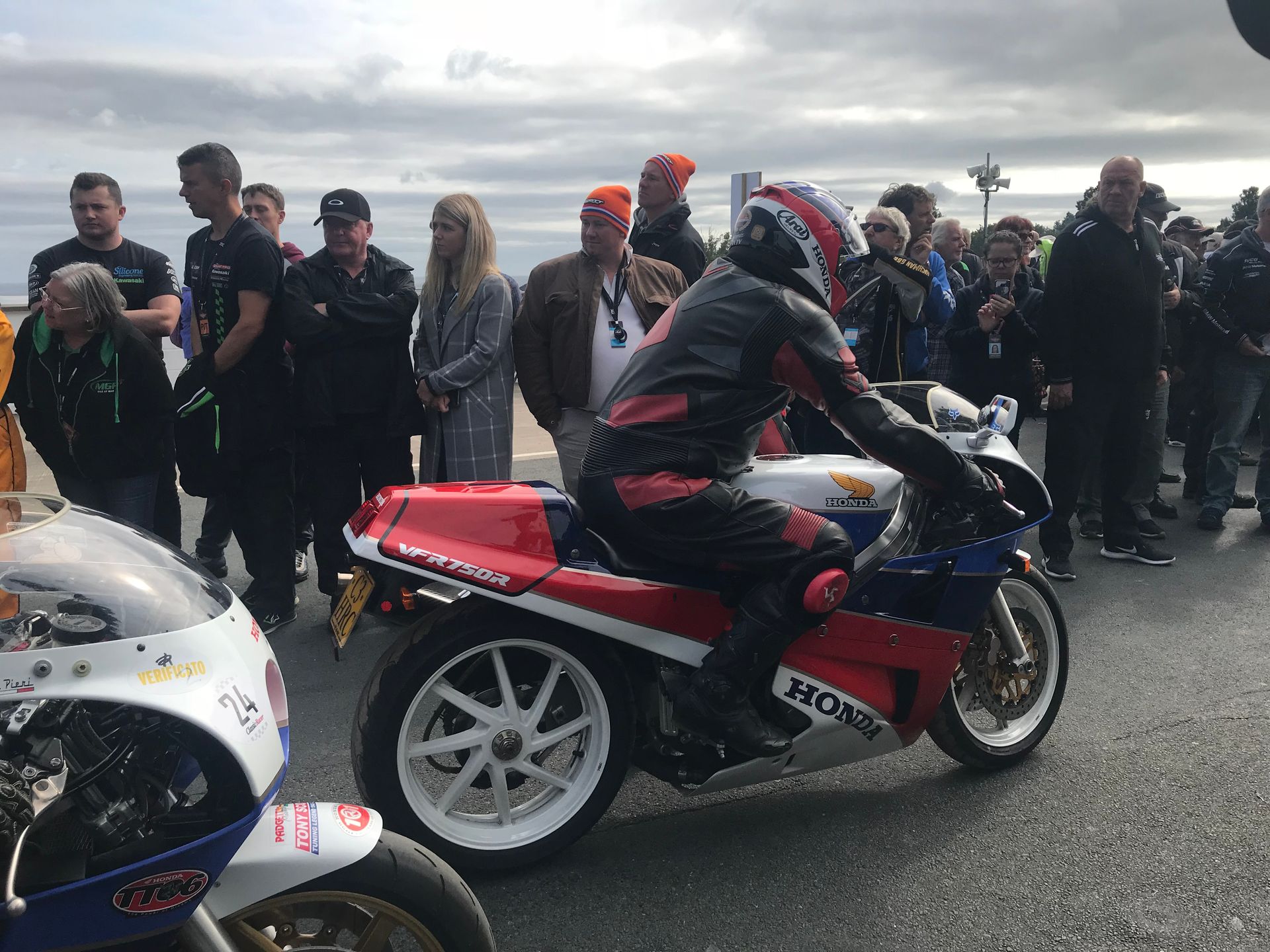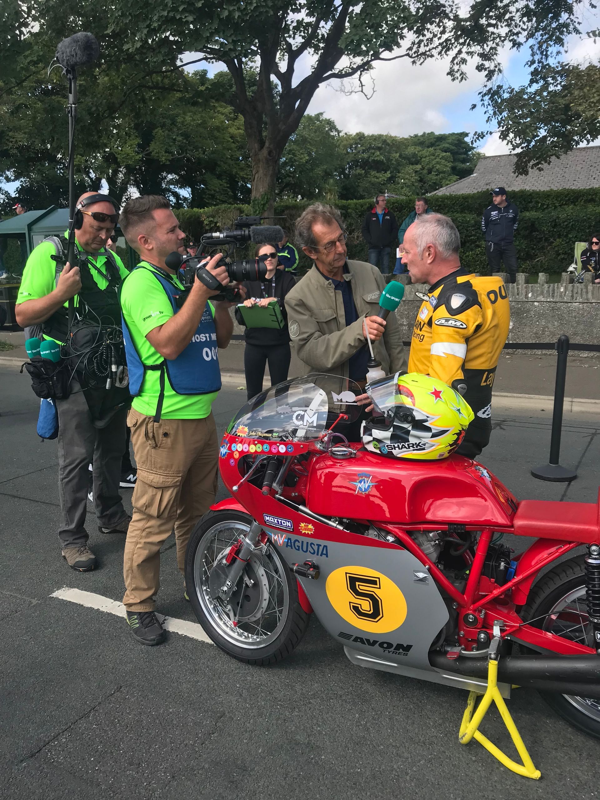 Mick was brilliant, most of the buyers of the platinum tickets were corporate, so not really there for the bikes, and had soon wandered off, leaving just a handful of us with Mick and he looked after us so well. Just before practice he bundled us into a borrowed course car and went off to visit an old lady Mick knew who had bungalow on Bray hill. We had tea and cake while bikes flew by at 180mph inches away from us as we sat on her garden wall. It was so raw and physical, the sound, the smell and the pulse of energy that surged through your body is indescribable. If you’ve never done it, get in a hedge on the circuit for an experience of your life. Intoxicating and addictive. He also introduced us to Davison’s Ice cream, possibly the best in the world. Walking round the paddock and on the grid we met everyone and really felt part of the excitement.