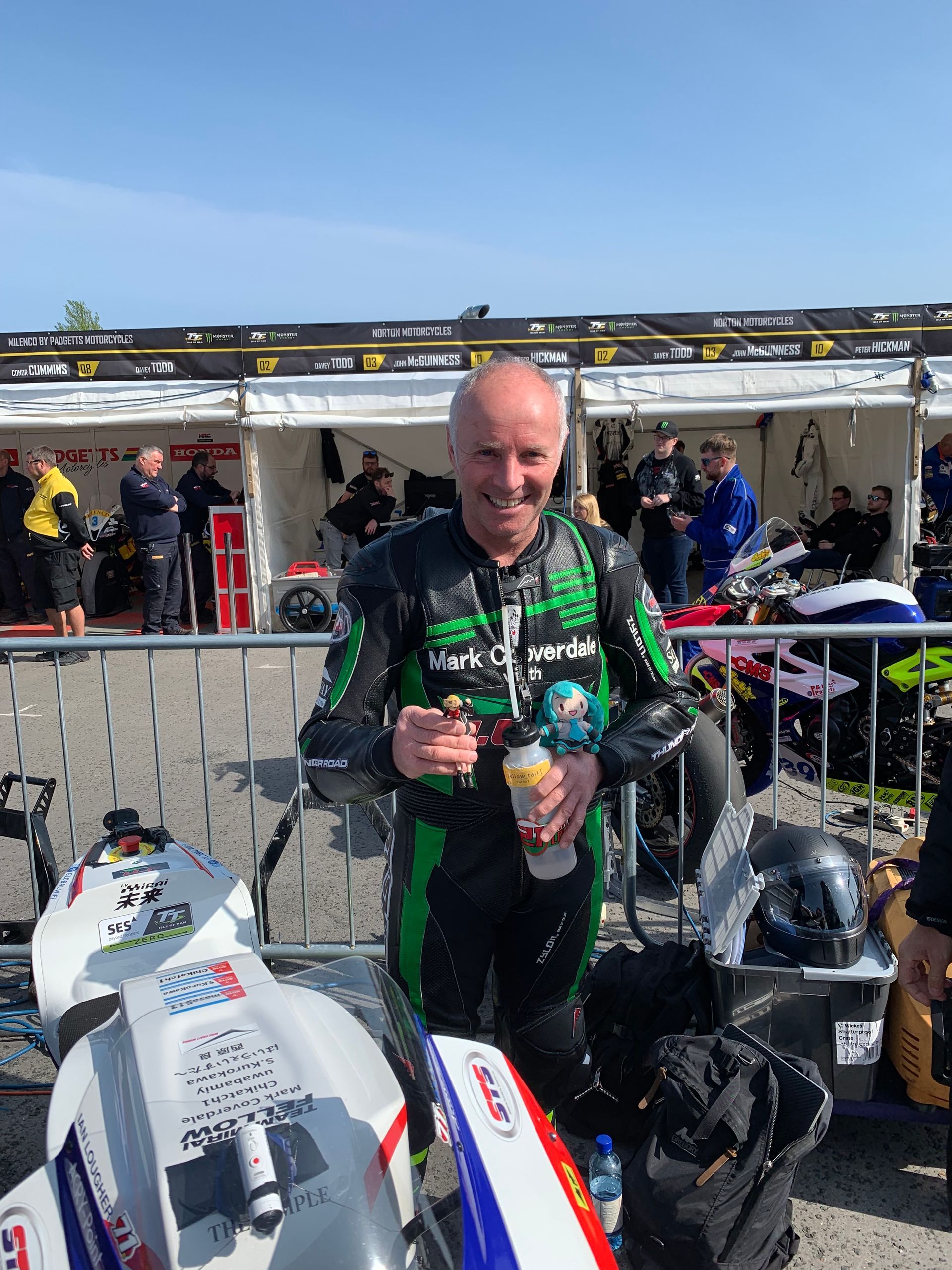 A win at the TT with one of our bikes is still our goal and the only podium at the TT with with me in the team was Ian getting a wonderful and surprising third in the Zero race in 2019. Ian had been asked to ride the race by Yoshihiro Kishimoto who had designed and built the electric Mirai. It was surprising because the hand built Mirai bike’s powerbank had been on fire just a couple of days before and unfortunately the smouldering batteries had to be buried by the fire brigade off the circuit near where the bike stopped. We were so grateful to the other teams who lent us batteries to allow us to compete and come in third behind the two Hondas. I was overjoyed with that result so proud of Ian, Yoshi and the team. The podium, was Michael Rutter, John McGuinness and Ian Lougher and I was hollering with excitement and delight. It’s for those moments that you do it.