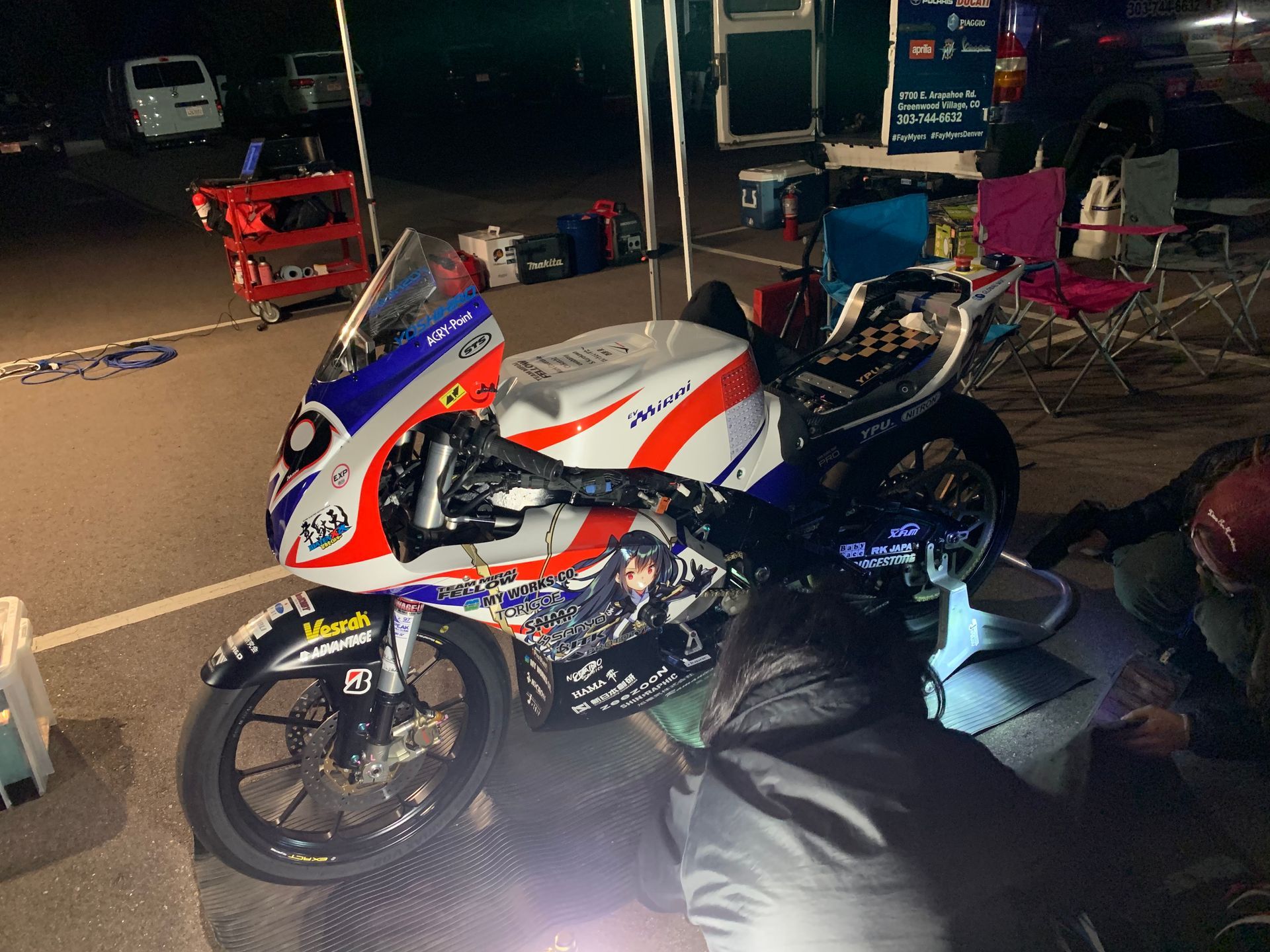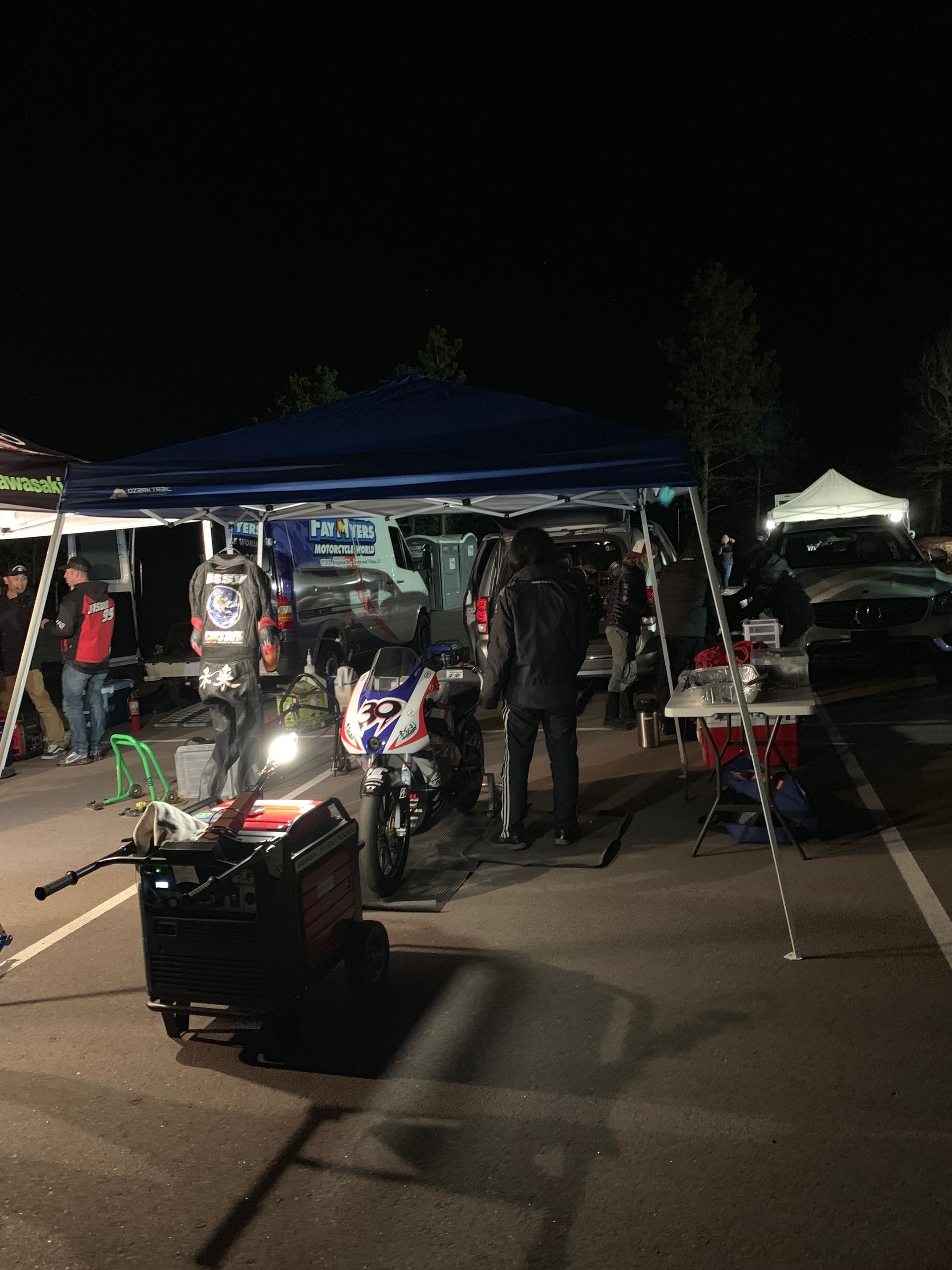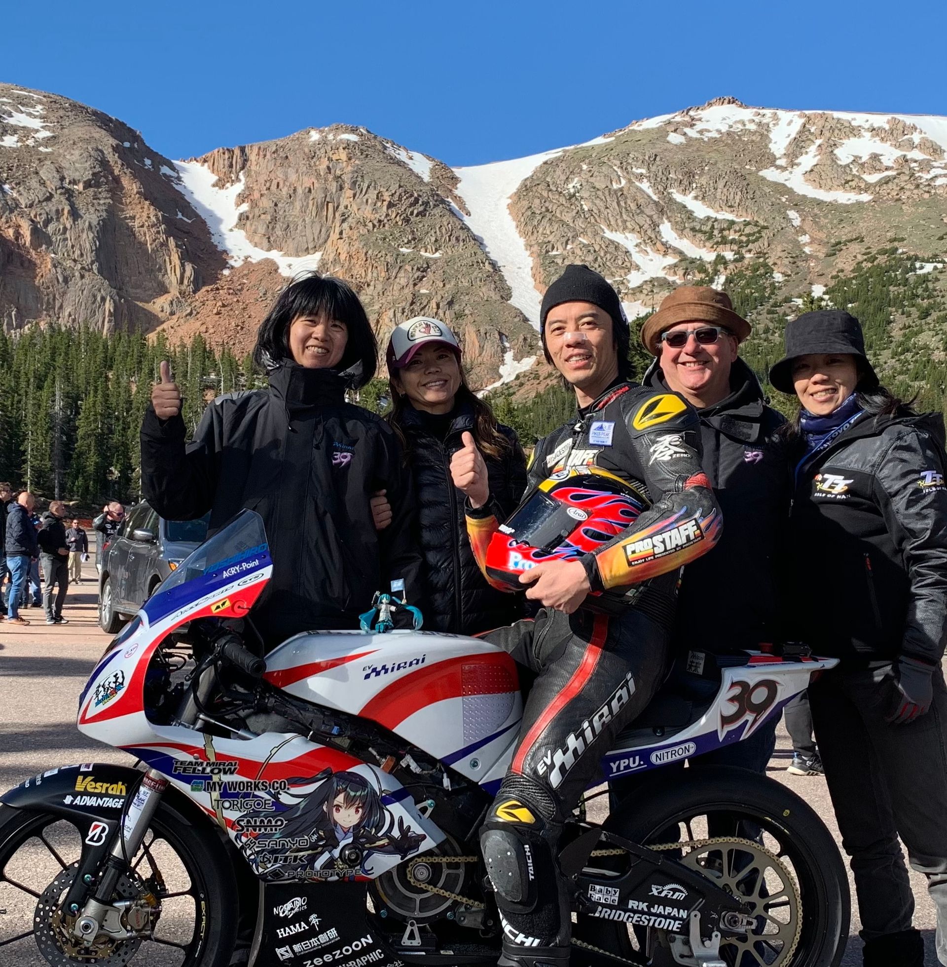 Another highlight was going to Pikes Peak sponsoring the Mirai of Yoshihiro Kishimoto as its rider. Pikes Peak is the highest peak in the rockies and the Hill Climb runs from 9390 feet elevation to the summit at 14110 feet. With a distance of nearly 12.4 miles and 156 bends mostly hairpins with sheer drops. At such altitude its a huge technical and physical challenge. It wasn’t the result but the event itself that was fantastic. It was such a privilege to be part of a paddock so high up the mountain. We had to set up paddock in the middle of the night to prepare for practice. It was a challenge for all the teams to climb in rental cars and vans to assemble at the three different stages each night of practice week and work in such cold and windy conditions. You are totally exposed to the elements and Keiko and I ended up wearing every article of clothing we had brought to try and stay warm. The altitude took its toll on us too and at the higher stages had to take the occasional puff of oxygen we carried with us. Experiencing dawn there was probably the most beautiful thing I have ever seen and it is indelibly marked on my soul. Unfortunately early in the race Yoshi left the track went into the trees and badly broke his ankle, and the American Carlin Dunne, who had been leading every practice on his prototype Ducati so close to victory at the summit left the road and so sadly lost his life.