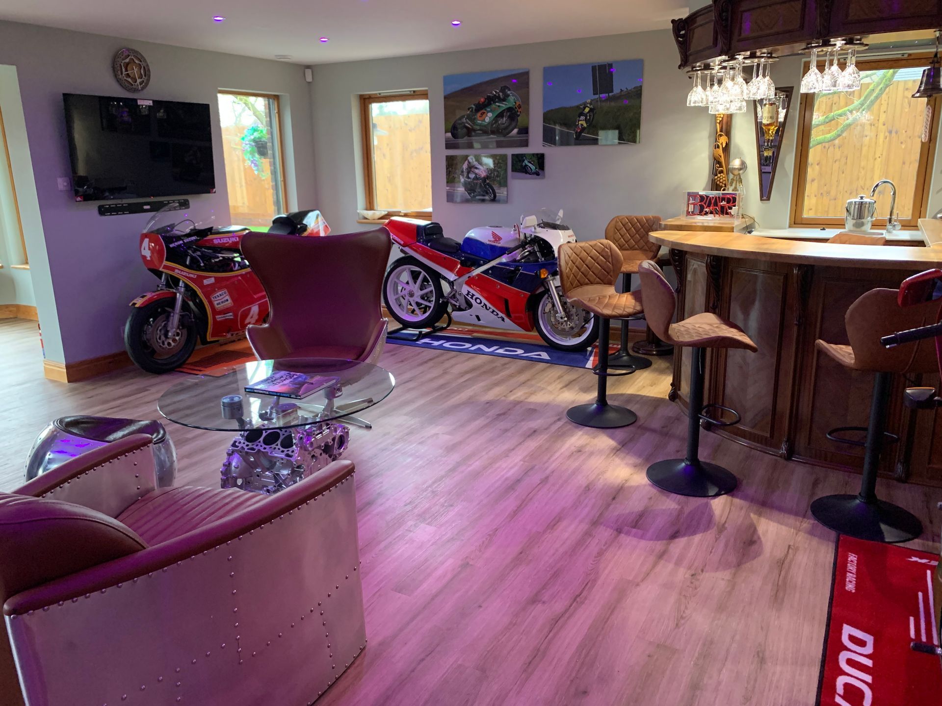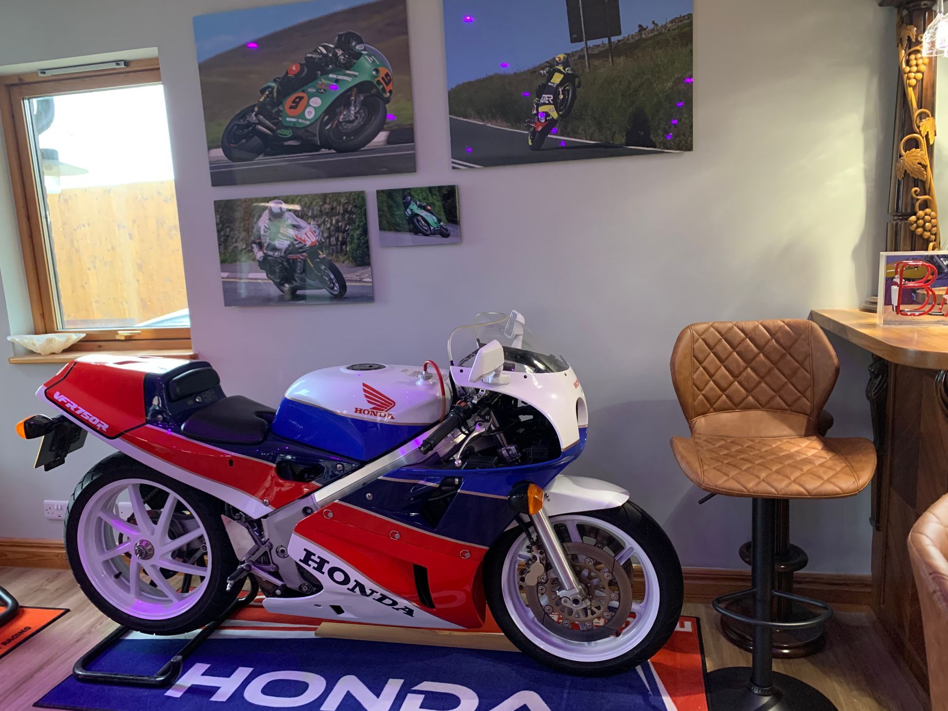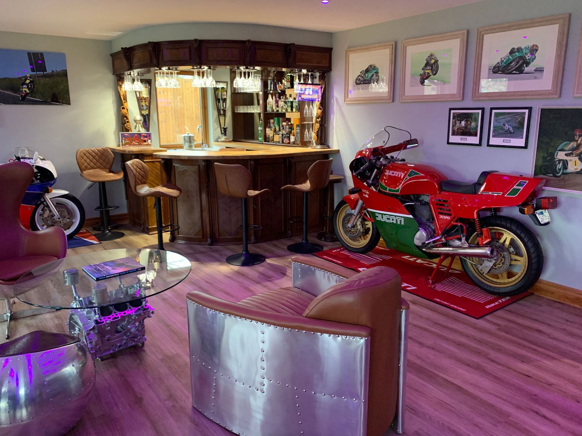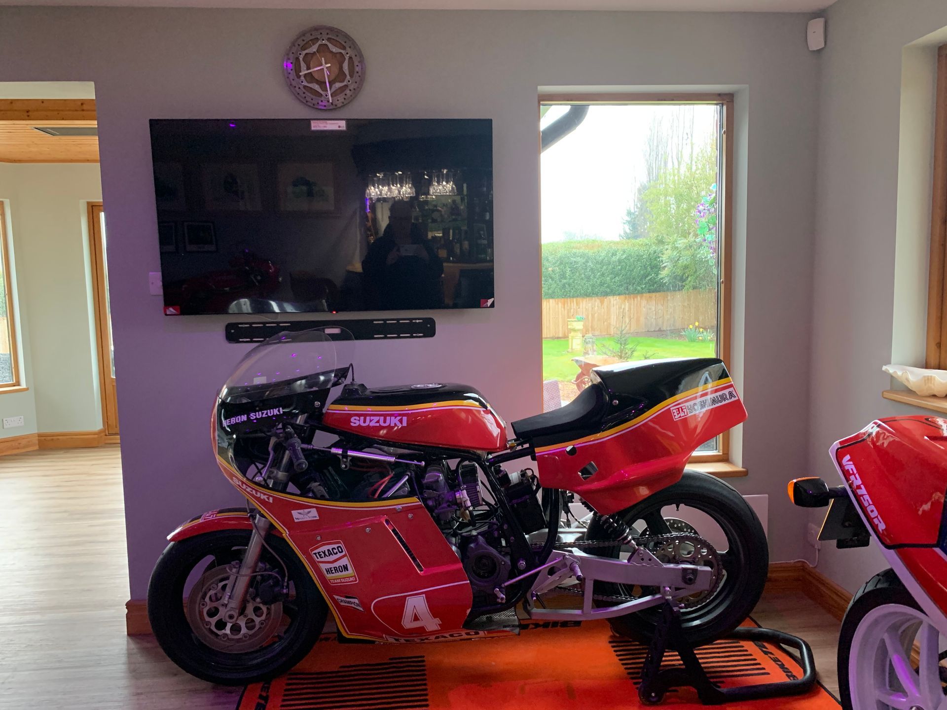 I still have my 99 Busa which like some of my other bikes, has an adapted gear shift for my duff ankle, an old blue RD400 and my faithful Suzuki Burgman. Its a giant 650 scooter which is such a surprisingly good bike, so comfortable, but handles astonishingly well. We recently got a FSIE in as a restoration project and when we got it back to the workshops Jacko and me were like dogs with two tails, initially forgetting the four in line gear sequence, but were soon bombing round the trading estate on it. In the house I have an Honda RC30, Norton Commando 750, Suzuki XR69 and a Ducati Hailwood Replica.