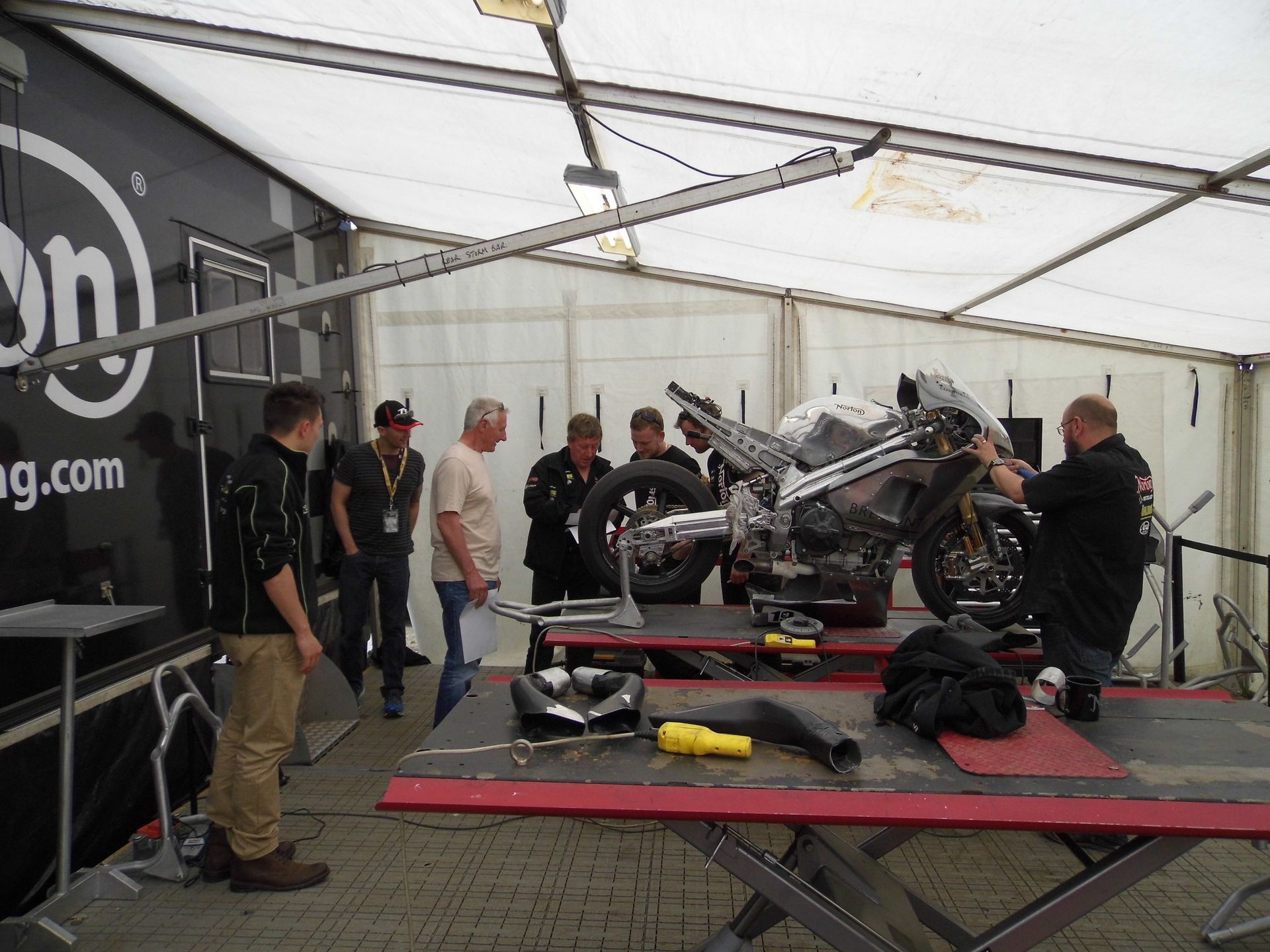 We did the same next year and we had already arranged with Mick that he would host us again. Had a brilliant visit again in 2014, Mick was working with Norton so we got to spend some time with the team. For one of the races I was late going to the grandstand so instead of rushing to join Mick and my sons I went out the back of the hospitality to view from the grass bank that overlooks the winners enclosure. It was the best spot to get a bit of a view of the pits. I was stood next to a bloke called Keith and we got chatting and became fast friends. He was sponsoring a bike and his excitement was wonderful. The team were first running in the low twenties then got to the high teens. He was totally made up, and that was the moment that the idea of my becoming a sponsor was born. When we walked into the hospitality my sons rushed up to me and asked for a Photo. I hadn’t known that my new friend was Keith Flint from the Prodigy. His sponsoring went from strength to strength culminating in TT wins. After then we only bumped into each other occasionally in race paddocks but he was always a kind, gentle and funny man, and his very sad passing was a huge loss to the motorcycle racing family. Mick Grant and Keith Flint were responsible of what happened next.