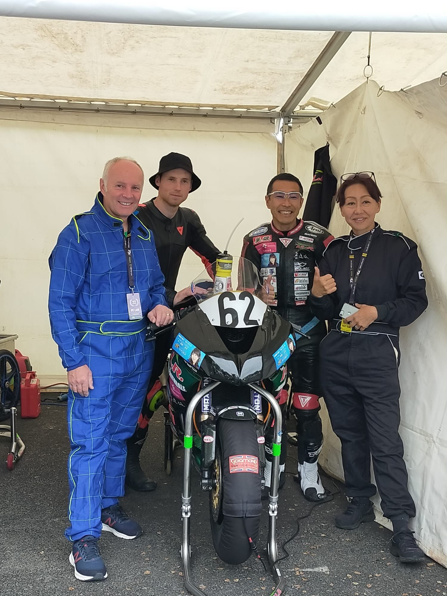 A win at the TT with one of our bikes is still our goal and the only podium at the TT with with me in the team was Ian getting a wonderful and surprising third in the Zero race in 2019. Ian had been asked to ride the race by Yoshihiro Kishimoto who had designed and built the electric Mirai. It was surprising because the hand built Mirai bike’s powerbank had been on fire just a couple of days before and unfortunately the smouldering batteries had to be buried by the fire brigade off the circuit near where the bike stopped. We were so grateful to the other teams who lent us batteries to allow us to compete and come in third behind the two Hondas. I was overjoyed with that result so proud of Ian, Yoshi and the team. The podium, was Michael Rutter, John McGuinness and Ian Lougher and I was hollering with excitement and delight. It’s for those moments that you do it.